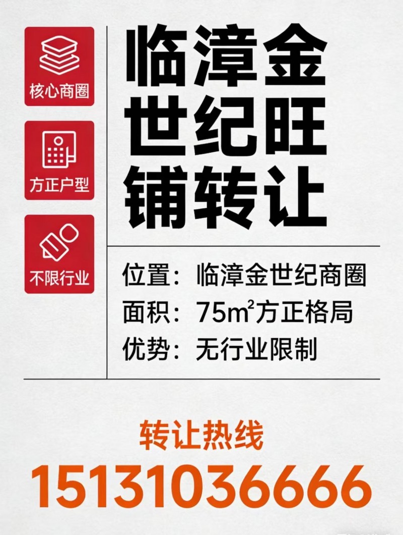 临漳金世纪75㎡旺铺转让 核心位置:临漳金世纪商圈 面积:75㎡,格局方正 优势:无行业限制,创业/转型灵活适配 转让热线:(非诚勿扰)